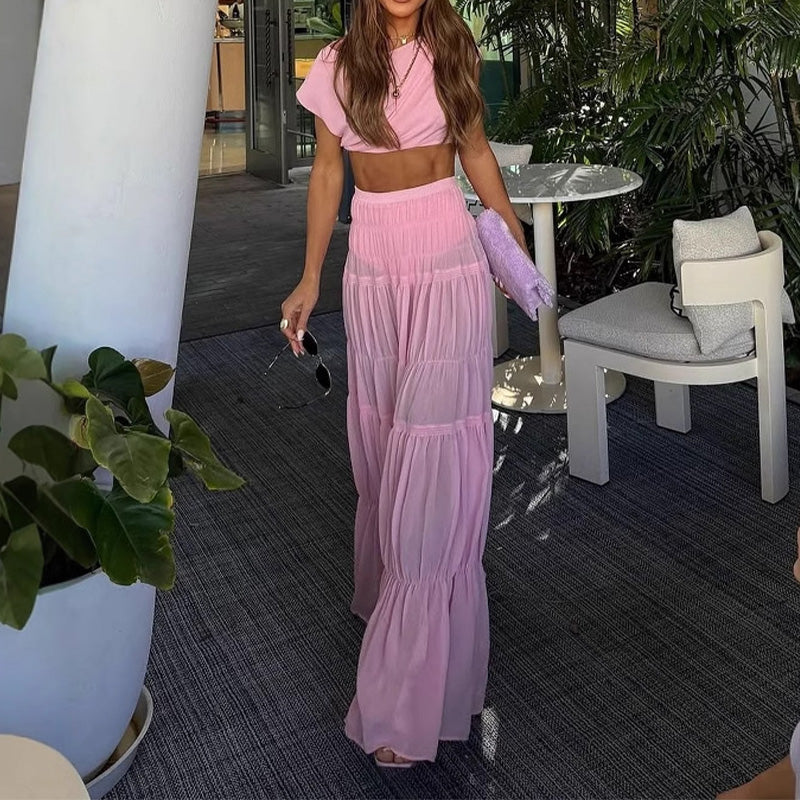 Stunning Chiffon Ruched Shoulder Crop Top & Elastic Waist Layered A-line Maxi Skirt
