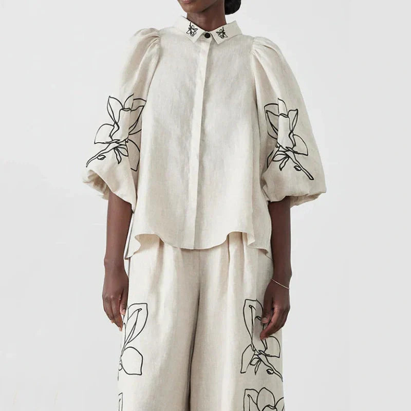 BALLOON SLEEVE DESIGN: The top features playful and chic balloon sleeves, complemented by a lapel collar and button detail, adding an elegant and trendy touch to the outfit.