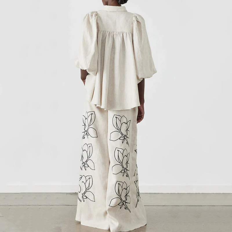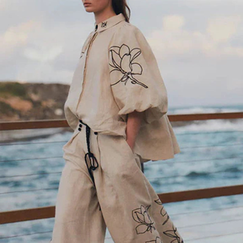 FLORAL PRINT: Both the top and pants are adorned with a black floral line print, creating a stylish yet understated look. The unique floral design breaks monotony and adds dynamic visual interest, making the outfit even more captivating.
