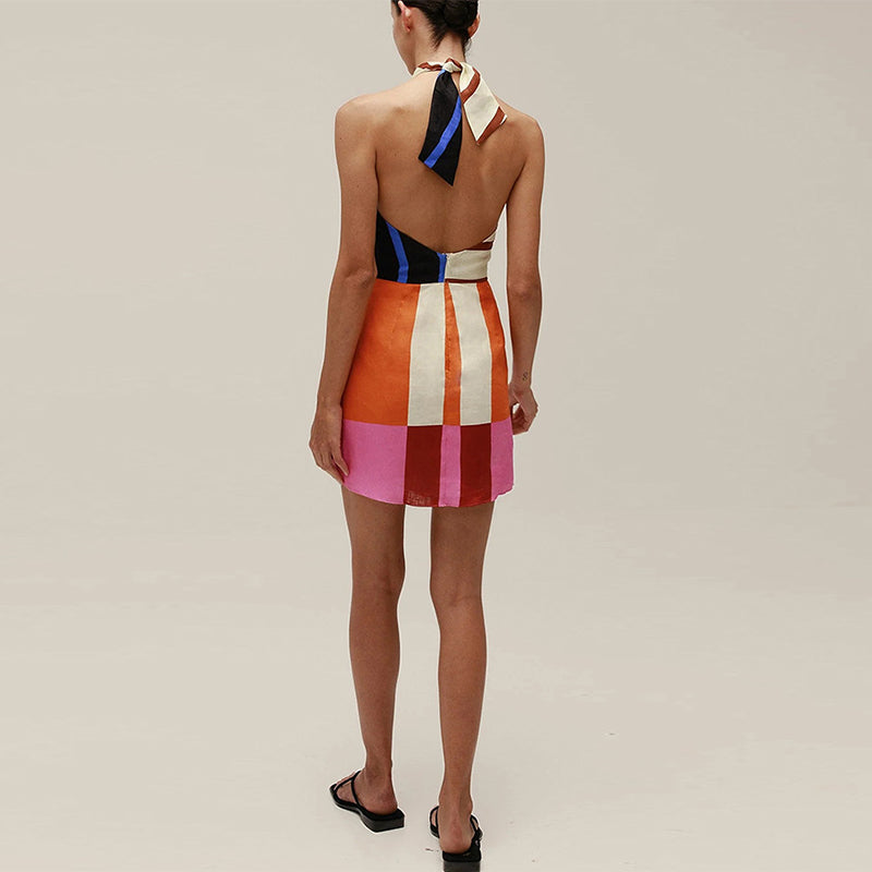 STYLISH DESIGN: Bold geometric print with contrasting colors creates a head-turning look. The sleeveless halter neckline is adjustable for a comfortable fit, while the daring open-back design adds a touch of sophistication.