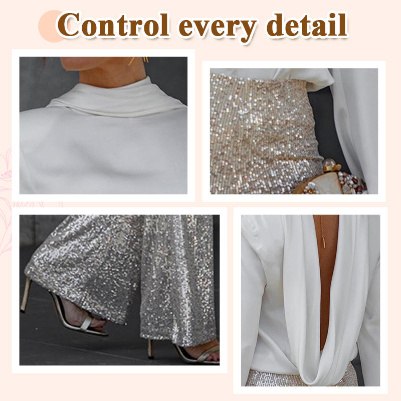 ELEGANT TWO-PIECE SET: This stylish set includes a chic open back draped blouse paired with sparkling sequin flared pants, offering a complete, head-turning look for any special occasion.